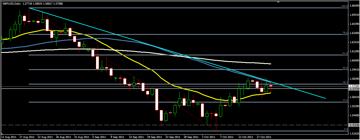 Cable is now at the 38% Fibonacci level taken from 18th of August highs and 5th October lows and the 50 day moving average.There is a trend line from the 19th July candle stick that is clearly a barrier at the 38% fib level. A break above the fib line might signal further strength to 5900 then the big psychological level of 6000.Will see how it pans out come tomorrow.